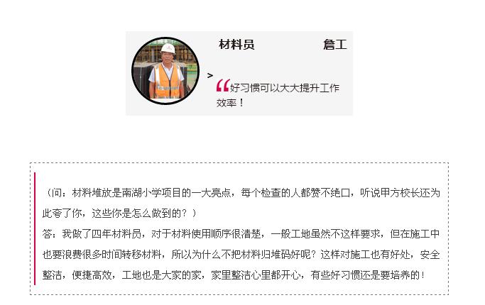 南湖小學項目是事關教育百年大計的重要民生工程,開工以來不僅受到各級政府領導的熱切關注,也受到集團領導的高度重視,自承接項目伊始,項目經(jīng)理徐家富就承諾:一定要把南湖小學項目做成集團的樣本工程,創(chuàng)杯工程,讓社會和政府滿意的工程!短短三個月的時間,南湖小學項目就取得了不少成就,不僅受到政府各級領導的表揚,也榮獲了集團各職能部門的一致好評,更讓他的承諾成功轉(zhuǎn)化為現(xiàn)實!