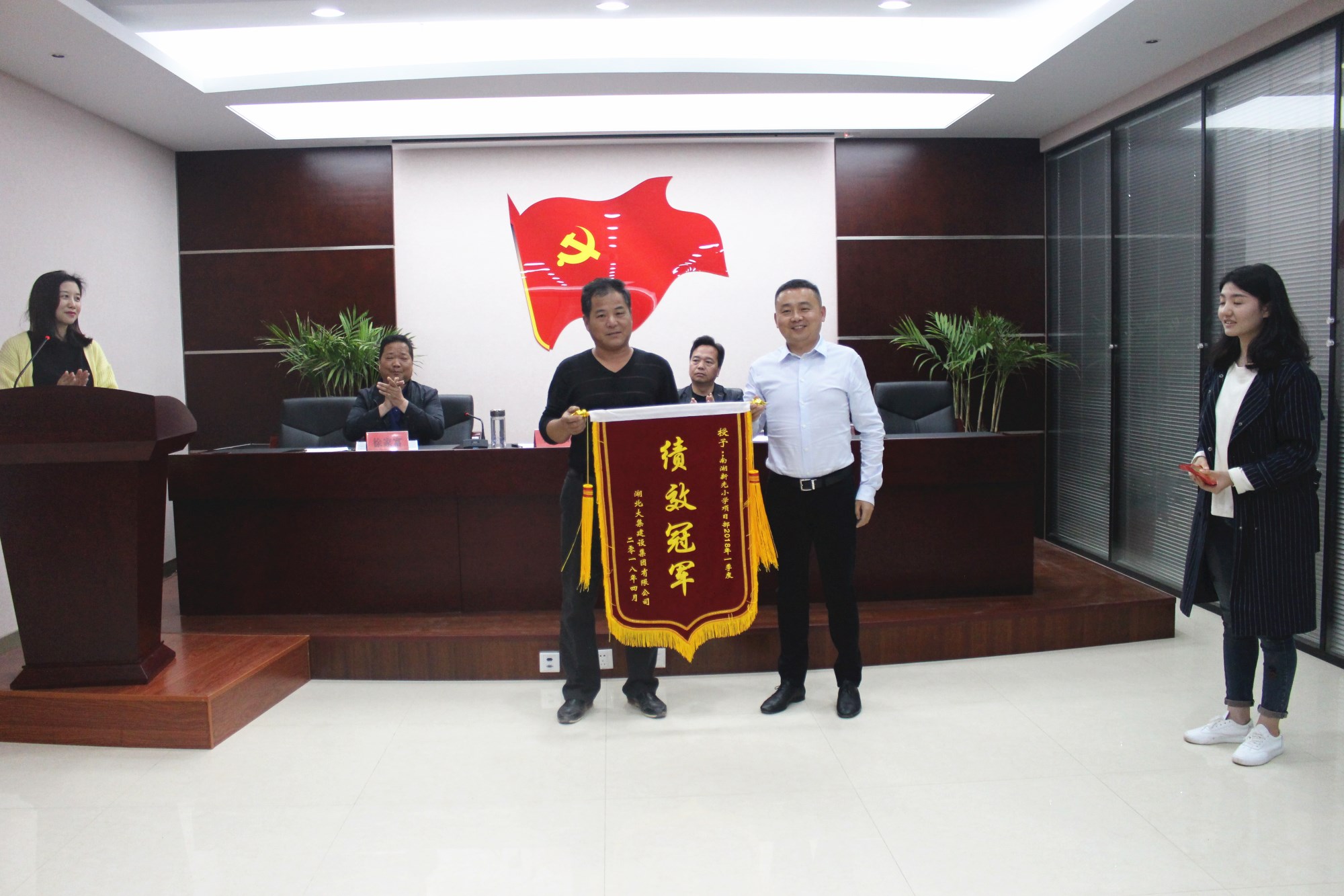 會議開始,由人事行政部公布第一季度績效考評結(jié)果,董事長徐濤親自向一季度績效冠軍——南湖(新光)小學(xué)項(xiàng)目頒發(fā)10000元獎金。