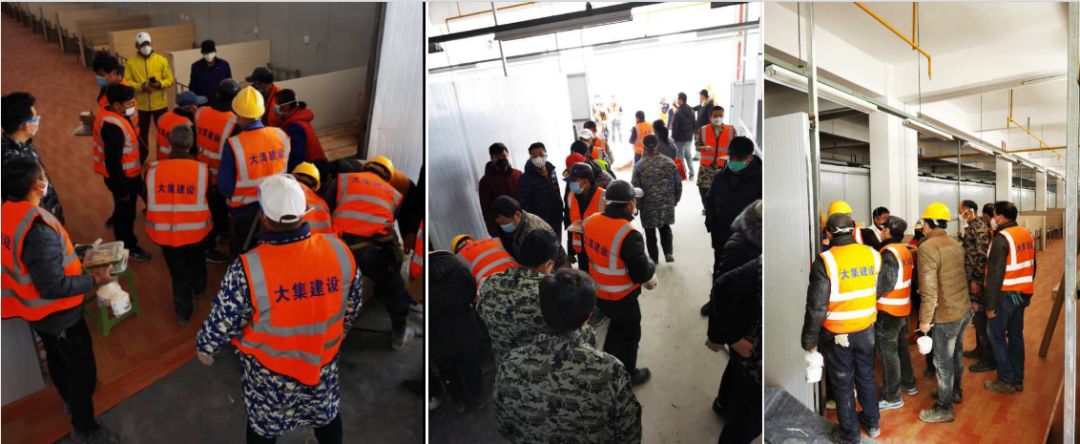 門外大雪紛飛,冰天雪地,屋內(nèi)緊張激烈,熱火朝天!針對人員不足、主材緊缺,施工隊伍難以調(diào)集,工期短,要求高,難度大等問題,董事長徐濤當機立斷,現(xiàn)場成立施工指揮部,由他親任總指揮,項目經(jīng)理周偉任副總指揮,周勝書任施工總負責,統(tǒng)籌現(xiàn)場大小事宜;張笠、裴行超、徐駿、汪勇、周峰、王洪波等項目經(jīng)理全體上陣,大家分工合作,細化施工圖紙,統(tǒng)籌施工組織,迅速形成一條集人員調(diào)配,材料供應(yīng),運輸保障,后勤服務(wù),財務(wù)支援等無縫對接的閉環(huán)作戰(zhàn)鏈條,大家相互支援,齊心協(xié)力,當天便迅速組織起了包括泥工、木工、水電工、搬運、雜工等在內(nèi)的兩百多人的施工團隊,大量主材、輔料也陸續(xù)到位,各項工作開始緊張有序地開展,短短五天時間,湖北大集建設(shè)集團便圓滿完成施工任務(wù),為區(qū)指揮部交上一份完美的答卷,也向社會展示了公司專注、專業(yè)的大集速度!