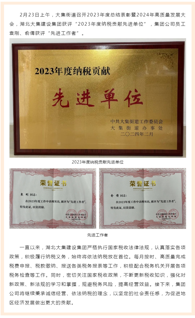 喜報(bào)!湖北大集建設(shè)集團(tuán)榮獲“2023年度納稅貢獻(xiàn)先進(jìn)單位”榮譽(yù)